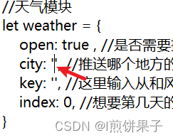 然后输入我们上面获取到的和风天气的key (在两个单引号中间输入,引号不能删掉,引号内不要有多余的空格)