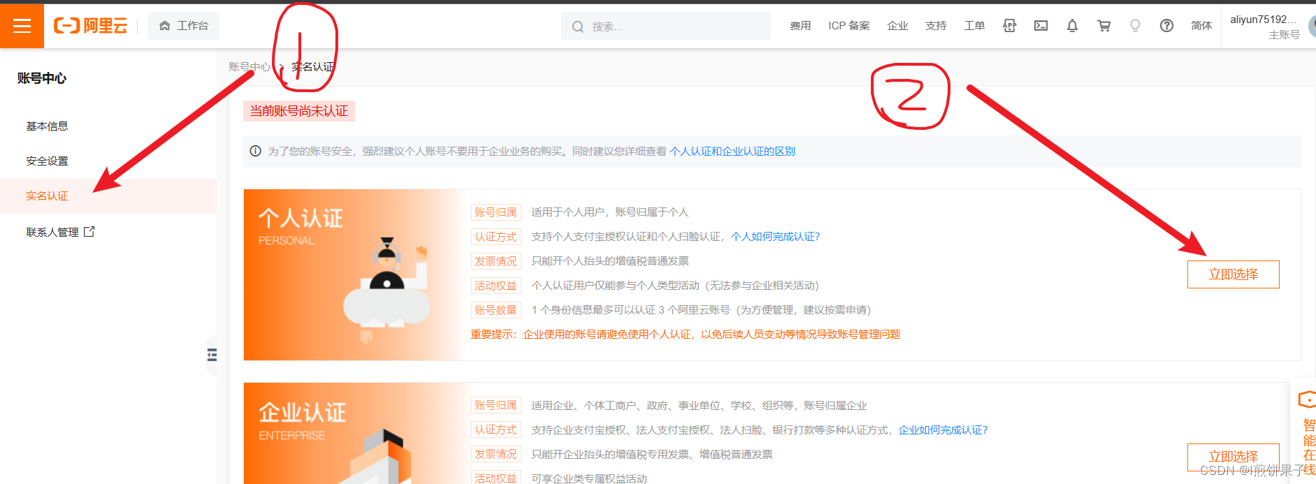 进入账号中心,实名认证 账号中心 (aliyun.com)