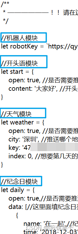 打开文件,可以看到文件中有8个模块,机器人Webhook、开头语、课表、天气、倒数日、结束语、彩虹屁模块、是否艾特所有人,分别对应下图: (机器人Webhook是用来发送消息的)