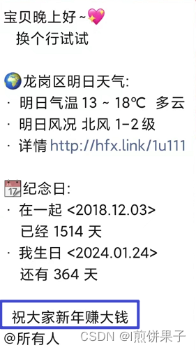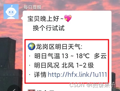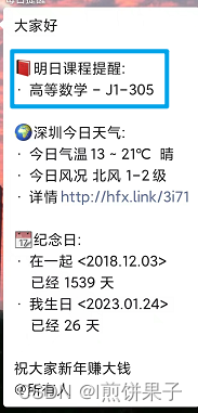 本文到此结束,如果想知道推送详细代码和原理的,可以查看我另一篇文章 :超详细 企业微信推送每日天气或课表(所有东西都可推送)_l煎饼果子的博客