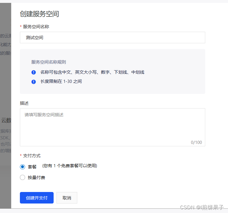 创建,记得在“支付方式”中选择 “套餐”,就能免费了(虽然按量收费也不贵,但是白嫖到底嘿嘿)