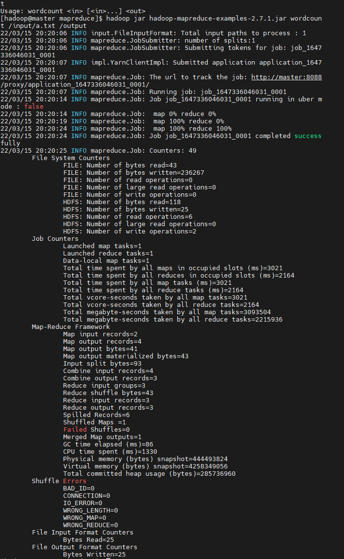 hadoop jar hadoop-mapreduce-examples-2.7.1.jar wordcount /input/a.txt /output