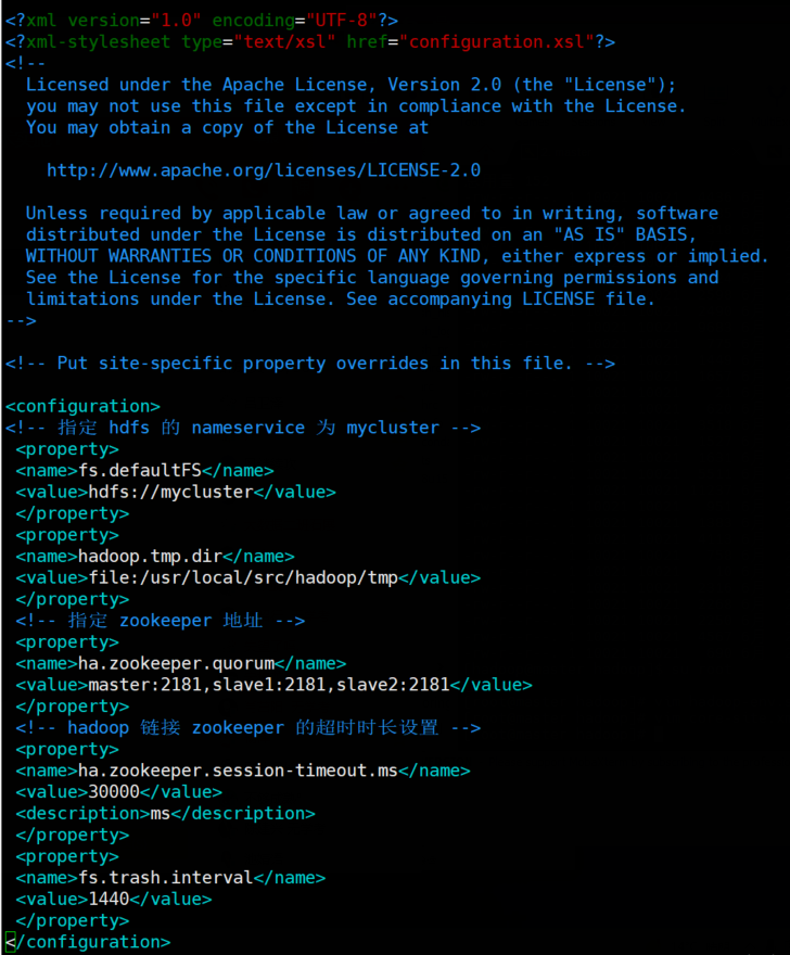 <!-- mycluster 下面有两个 NameNode,分别是 master,slave1 -->