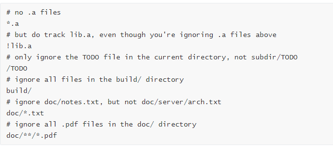 | 将文件添加至忽略列表 | 在工作目录中创建一个名为 .gitignore 的文件(文件名称固定),列出要忽略的文件模式。 | |||||