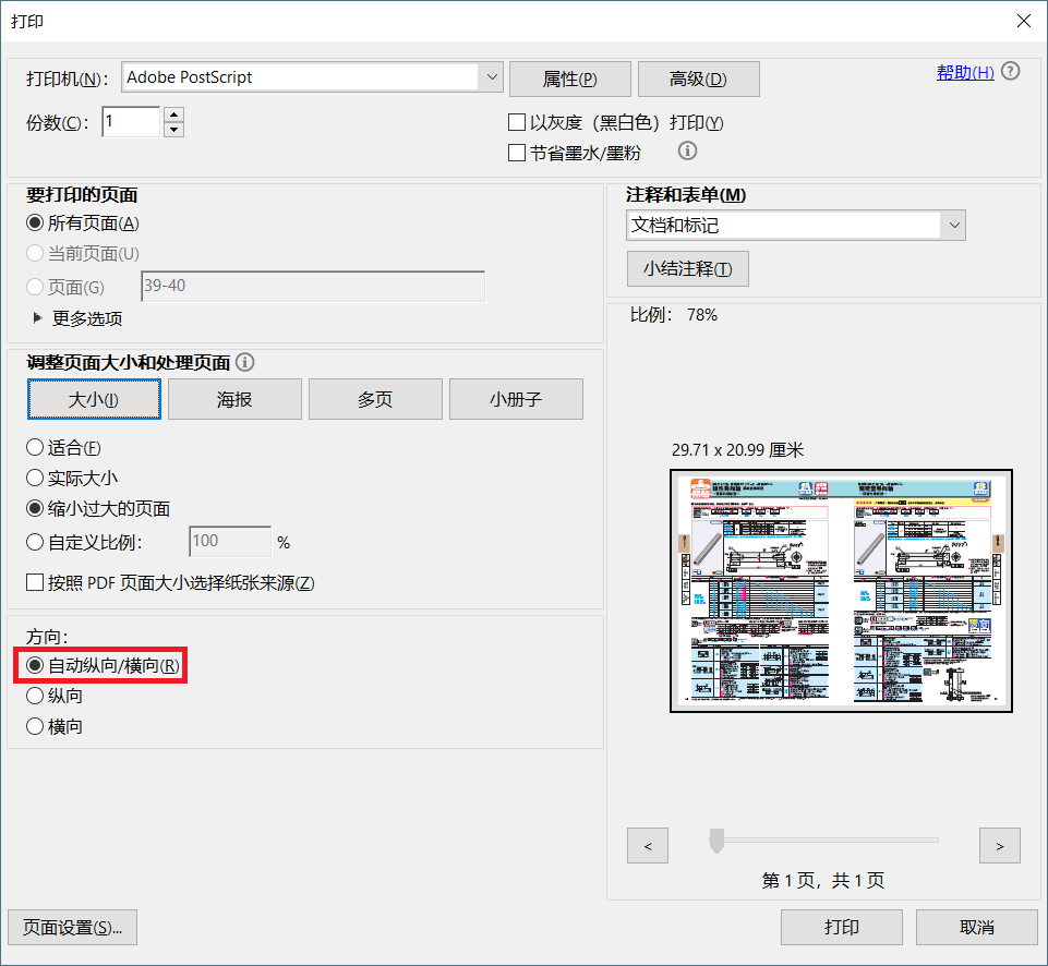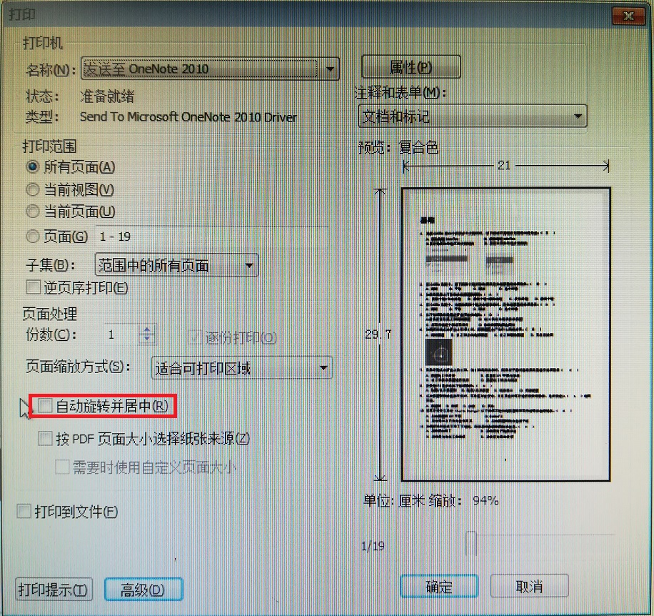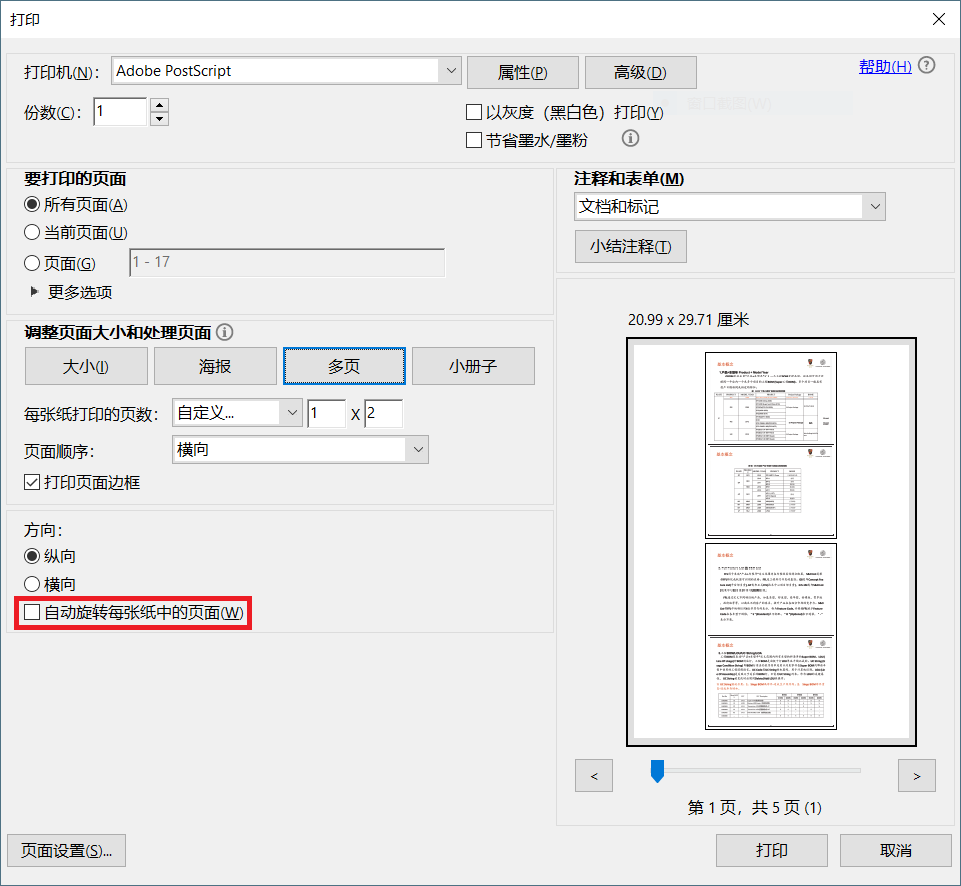 较旧版本的Adobe Reader\Acrobat的打印设置界面中,有一项叫做“自动旋转并居中”,在较新版本中叫做“自动纵向/横向”,或者“自动旋转每张纸中的页面”。因为我经常需要打印图纸,而图纸一般都是横向的,我在Reader中选择打印机,然后进入打印机属性,设定纸张方向为横向,但打印出来的结果经常是,第1张纸为纵向(错误方向),从第2张纸开始就全部是横向了(正确方向),不论是单面打印还是双面打印,不论是长边装订还是短边装订。这个第1页方向错误其余页方向全部正确的问题也不是100%会出现,但是频率很高,困扰我很久之后,我仔细看Reader的打印设置界面,觉得“自动旋转并居中”这个选项最可疑,去掉勾选后,生活都变得美好了许多。