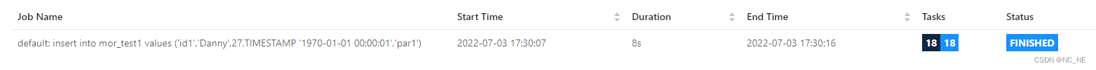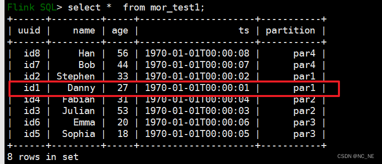 ('id8','Han',56,TIMESTAMP '1970-01-01 00:00:08','par4');2.2、成功插入数据,查询数据