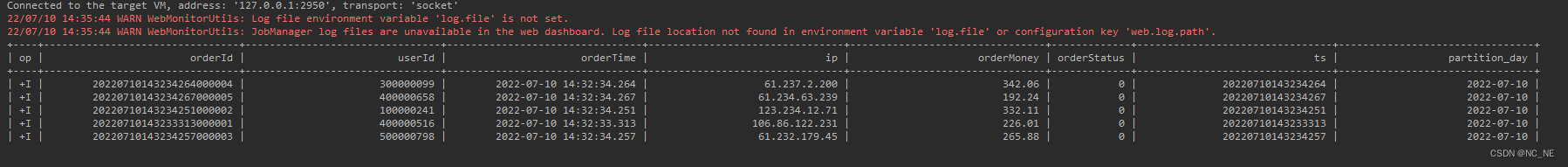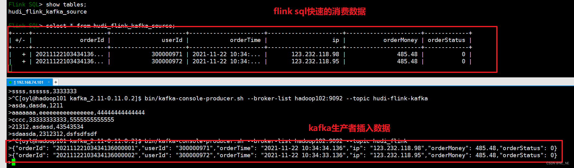 流式读取没法在一个FlinkSQL Client内完成,需要两个客户端,一个客户端负责往表里面写数据,另一个客户端实时读数据