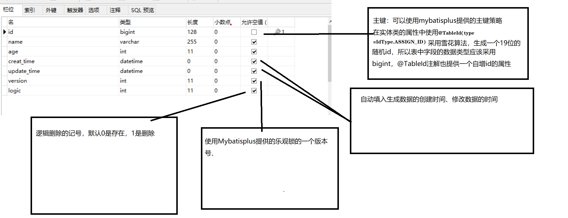 //主键策略:采用雪花算法随机生成id值,java中id为Long类型,mysql中id为BigInt,随机id为19位,所以数据类型必须大