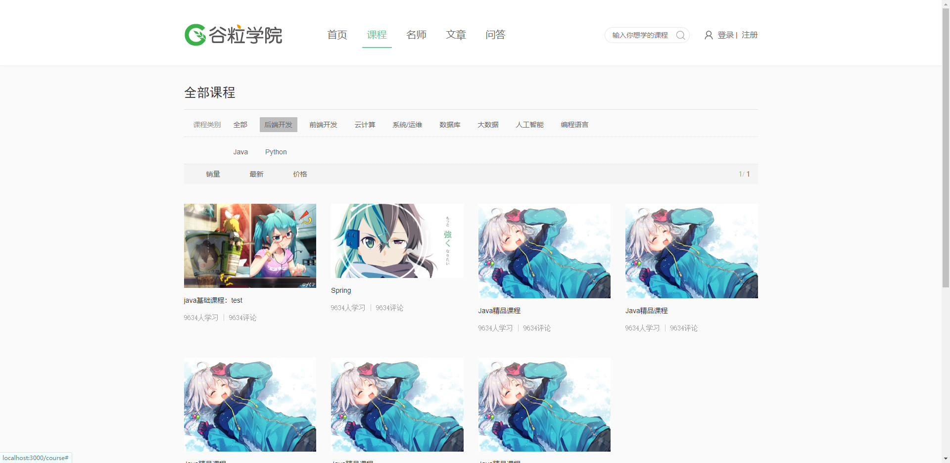 前台用户系统包括:首页、课程、名师、问答、文章。
