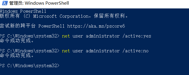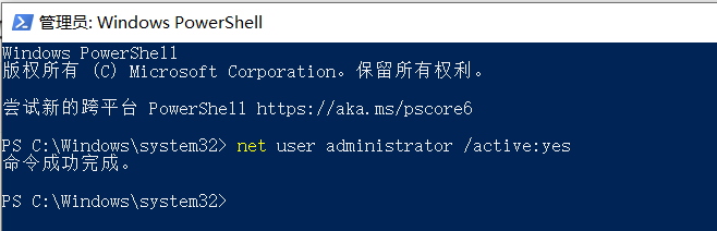 开启超级用户:输入 net user administrator /active:yes