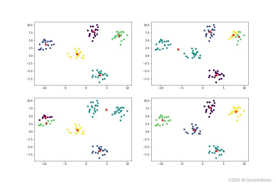下图便是代码跑出来的结果,多运行几次会发现不调库实现的Kmeans聚类结果会各种各样,即不调库实现的Kmeans结果大部分情况下都是局部最优,并非全局最优