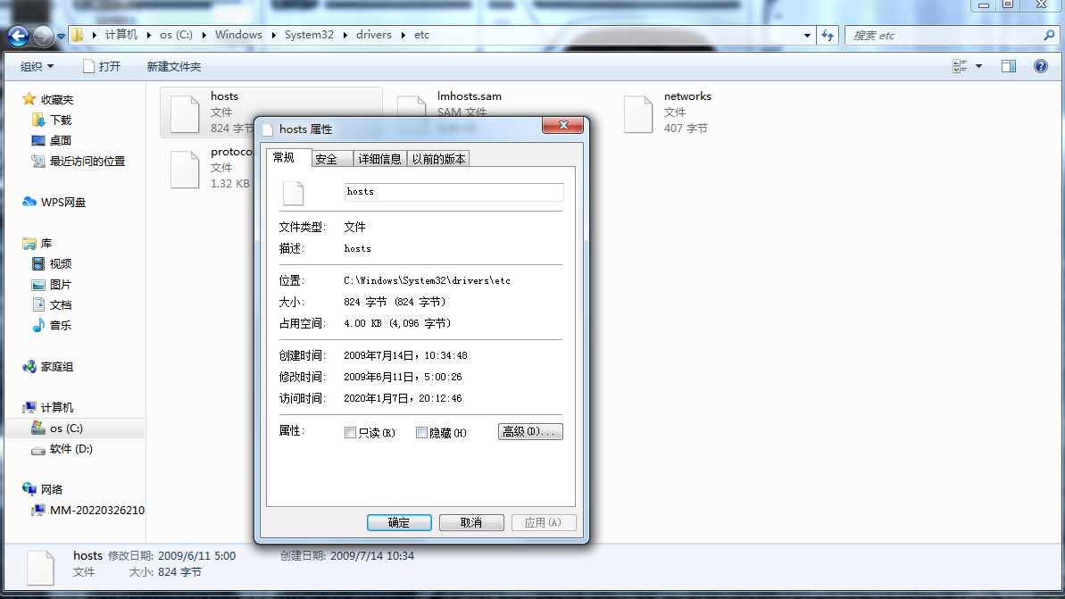 右击hosts文件——常规——属性右边的"只读" 勾去掉,如下图。