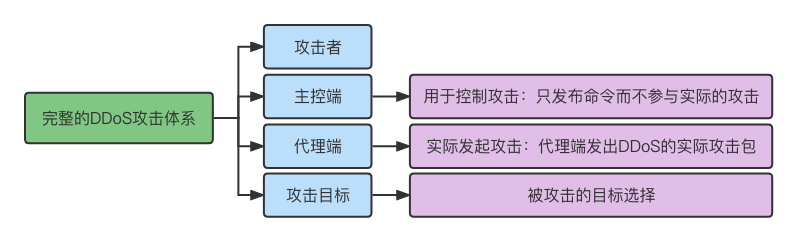一个完整的DDoS攻击体系由攻击者、主控端、代理端和攻击目标四部分组成。