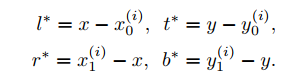 把每张feature map的每个坐标都可以映射回原输入图像。如果某个feature map的坐标落在某个ground truth的框内,那么这就是一个正样本,可以拿来做训练。首先做个映射,计算feature map中的这个点,到ground truth的距离。如下图所示,这就是训练阶段的回归目标。