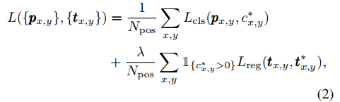 损失函数如下所示。前半部分是分类的focal loss(这篇文章都是在和RetinaNet做对比,很多参数设置和它一样),后半部分是IOU loss。