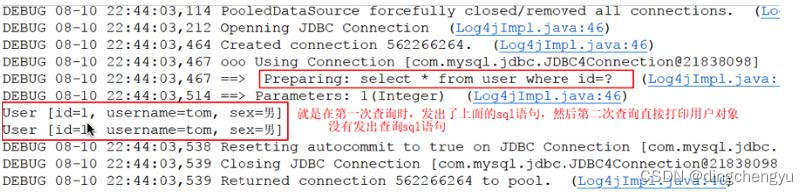 //第⼆次查询,由于是同⼀个sqlSession,会在缓存中查询结果