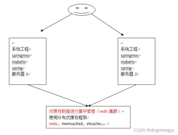 如上图所示,在⼏个不同的服务器之间,我们使⽤第三⽅缓存框架,将缓存都放在这个第三⽅框架中,然后⽆论有多少台服务器,我们都能从缓存中获取数据。