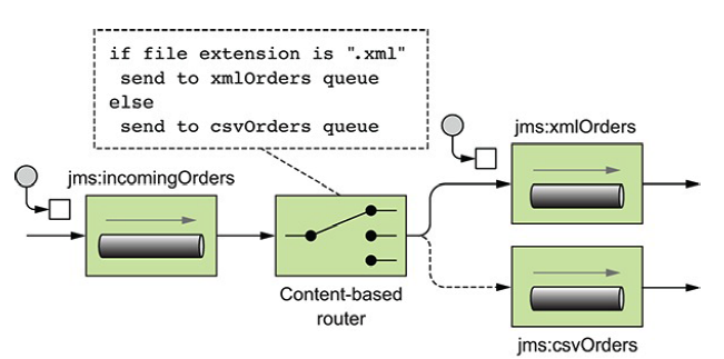 图2.10 CBR路由最终的目的地取决于消息内容。在这个场景下,文件的后缀名(会存储在header中)会被用来确定路由的目标