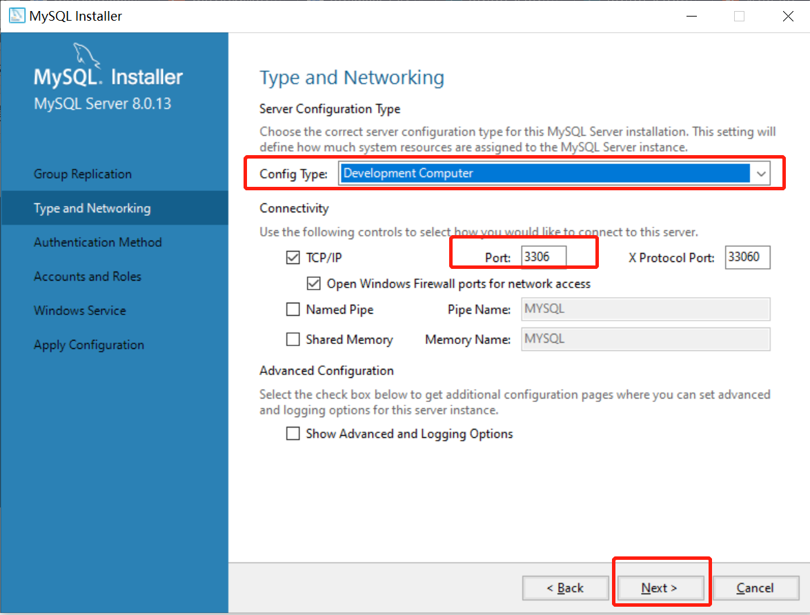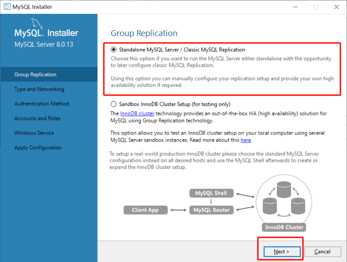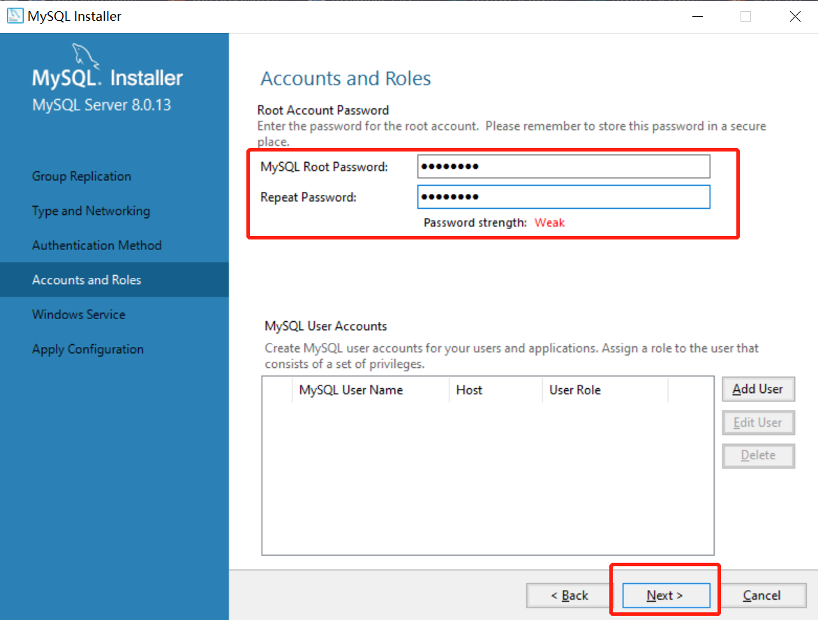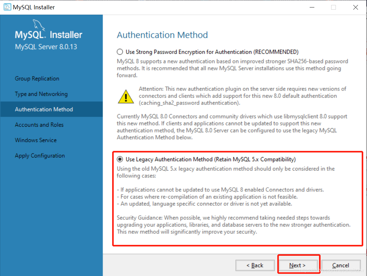 说明:第一种是MySQL 8.0新支持的认证方式,第二种是MySQL 5.x的旧的认证方式。如果选择第一种,使用数据库链接工具时会报错,为了更好兼容推荐选择第二种认证方式!