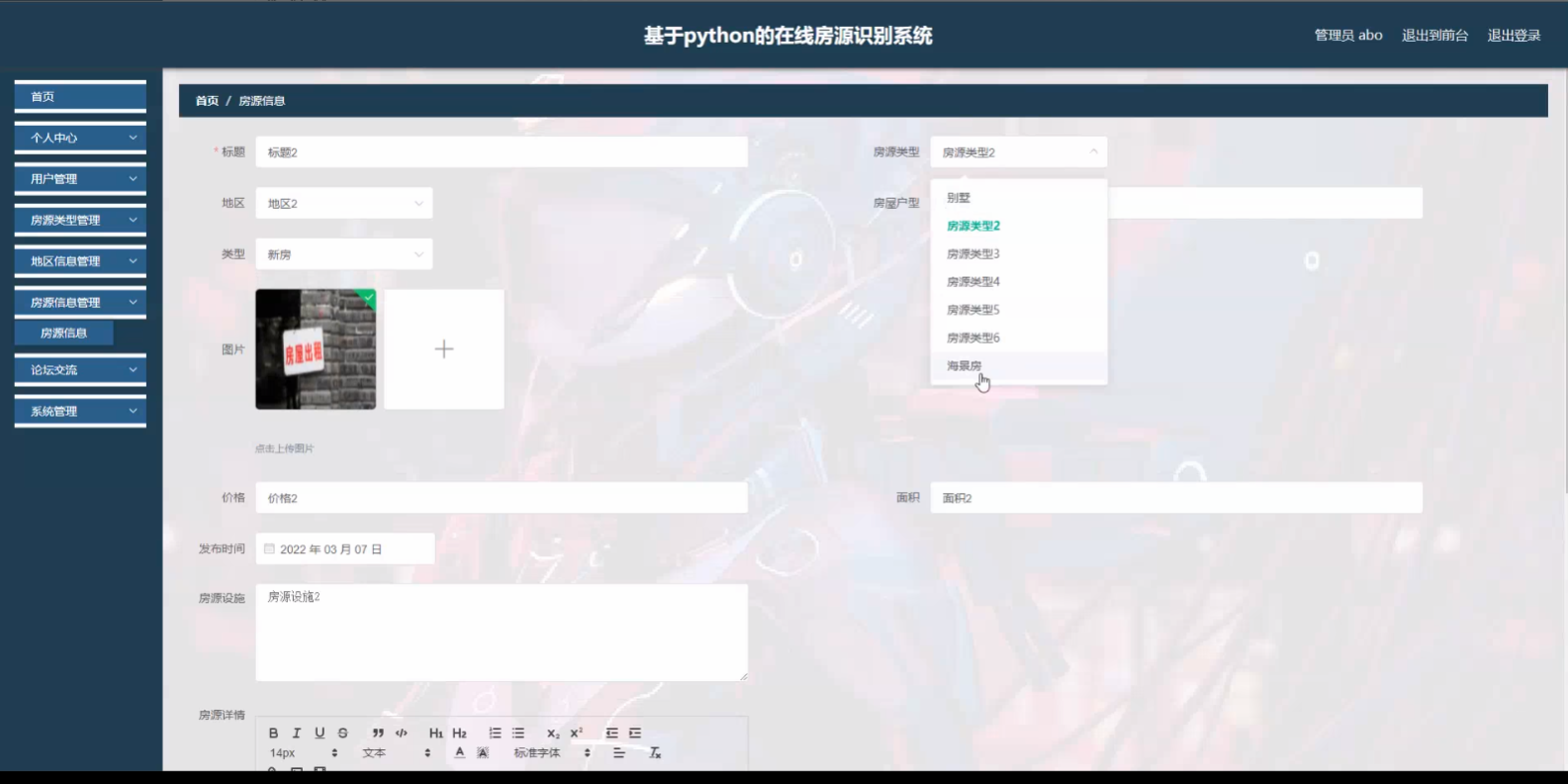 基于Python的在线房源识别系统》该项目采用技术Python的django框架、mysql数据库 ,项目含有源码、文档、PPT、配套开发软件、软件安装教程、项目发布教程、核心代码介绍视频等