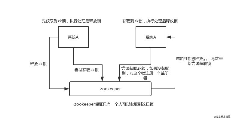 这个其实是 zookeeper 很经典的一个用法,简单来说,就好比,你 A 系统发送个请求到 mq,然后 B 系统消息消费之后处理了。那 A 系统如何知道 B 系统的处理结果?用 zookeeper 就可以实现分布式系统之间的协调工作。A 系统发送请求之后可以在 zookeeper 上对某个节点的值注册个监听器,一旦 B 系统处理完了就修改 zookeeper 那个节点的值,A 系统立马就可以收到通知,完美解决。