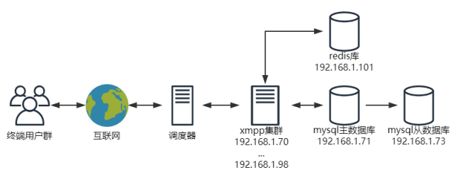 按照超过25台节点方式构建xmpp集群,为了提高数据库性能,采用独立服务器作为数据库服务器,注意:需选用CPU频率和内核数尽量高的主机作为mysql服务器;需选用内存频率足够快的主机作为redis服务器,为了性能最大化集群,最好采用硬件作为调度服务器,综合分析,此次我们内部测试架构按如下架构: