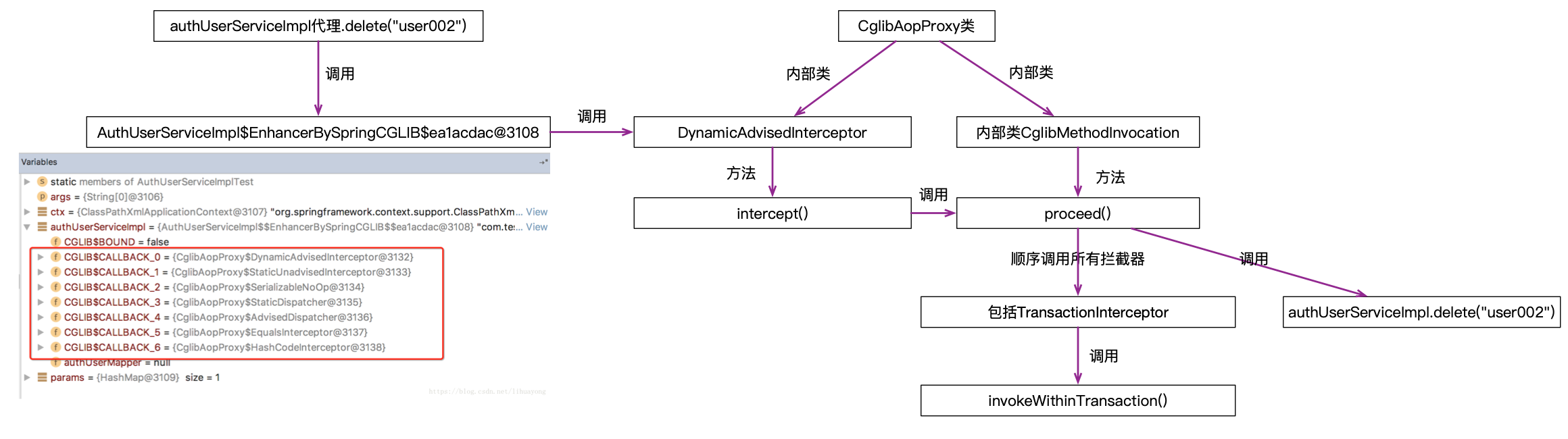 执行authUserServiceImpl.delete("user002")方法,通过调试执行下一步之后,就会进入到CglibAopProxy$DynamicAdvisedInterceptor这个拦截器的intercept()方法,其他的拦截器打了断点,貌似都没有执行,至于什么时候执行,不是本文关注的重点,忽略。
