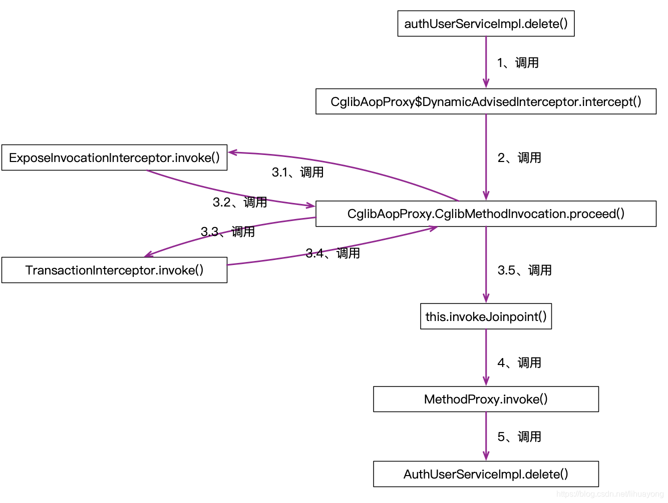 }从mi.proceed();这行就可以看得出来,使用mi这个变量,又调用回CglibMethodInvocation的proceed()方法。回到proceed()方法之后,this.currentInterceptorIndex已经被++,这样就可以取到列表中下一个拦截器,进而执行下一个拦截器的invoke()方法。