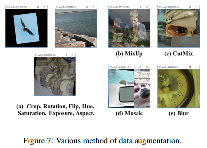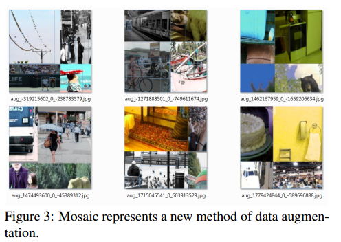 Mosaic是一种新型的数据增广的算法,它混合了四张训练图片。因此有四种不同的上下文进行融合,然而CutMix仅仅将两张图片进行融合。此外,batch normalization在每个网络层中计算四张不同图片的激活统计。这极大减少了一个大的mini-batch尺寸的需求。