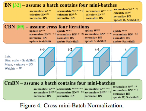 正如图4中显示,CmBN(Cross mini-Batch Normalization)代表CBN改进的版本。它只收集了一个批次中的mini-batches之间的统计数据。