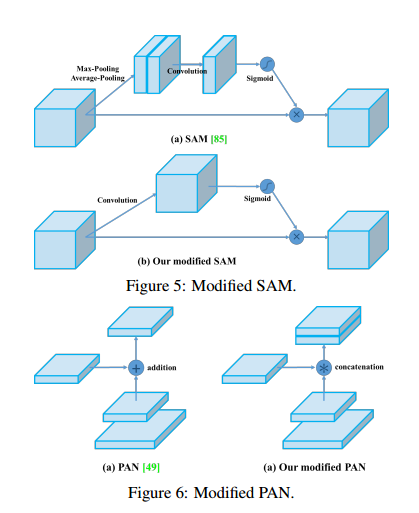 我们将SAM的spatial-wise注意力变成了point-wise注意力机制,然后将PAN中的shortcut连接变成了concatenation连接,正如图5和图6所表示的那样。