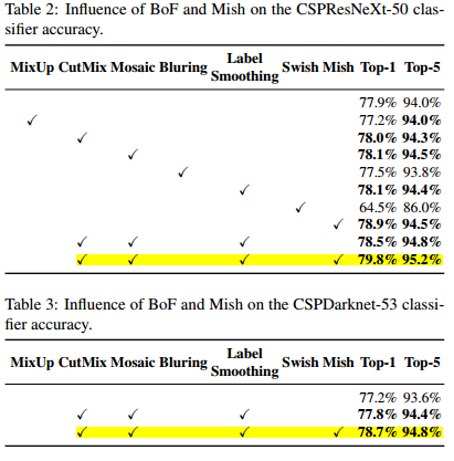 在表2中所示,在我们的实验中,通过引入一些算法,分类器的准确率得到了提升,这些算法包括:CutMix和Mosaic数据增广,Class label smoothing和Mish激活函数。结果,我们的用于分类器训练的BoF-backbone(Bag of Freebies)包括:Cutmix 和Mosaic数据增广算法以及Class labelsmoothing。正如表2和表3所示,我们将Mish激活函数作为补充的选项。