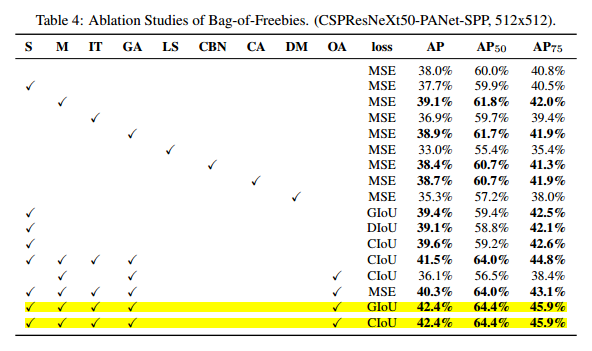 BoF | CutMix and Mosaic data augmentation DropBlock regularization Class label smoothing | CIoU-loss CmBN DropBlock regularization Mosaic data augmentation Self-Adversarial Training Eliminate grid sensitivity Using multiple anchors for a single ground truth Cosine annealing scheduler Optimal hyperparameters Random training shapes | |