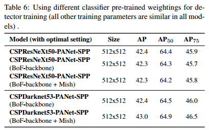 再者,CSPResNeXt-50分类器训练使用BoF和Mish提高了它的分类准确率,但是检测器训练使用的预训练权重的进一步使用减少了检测器的精度。但是,CSPDarknet53分类器训练使用BoF和Mish提高了分类器和检测器的准确率,它使用分类器预训练权重。这表示CSPDarknet53比CSPResNeXt-50更适合作为检测器。