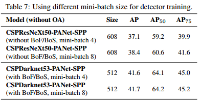 最后,我们分析了不同mini-batch尺寸的训练的模型的结果,并且结果在表7中显示出来。从表7中我们发现在添加了BoF和BoS训练策略之后,mini-batch尺寸几乎对检测器的性能没有影响。结果显示在引入了BoF和BoS之后,就不需要使用昂贵的GPUs进行训练。换句话说,任何人可以仅仅使用一个GPU去训练一个优秀的检测器。