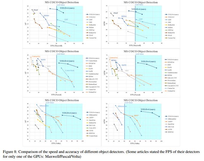 目前有很多可以提高CNN准确性的算法。这些算法的组合在庞大数据集上进行测试、对实验结果进行理论验证都是非常必要的。有些算法只在特定的模型上有效果,并且只对特定的问题有效,或者只对小规模的数据集有效;然而有些算法,比如batch-normalization和residual-connections,对大多数的模型、任务和数据集都适用。我们认为这样通用的算法包括:Weighted-Residual-Connections(WRC), Cross-Stage-Partial-connections(CSP), Cross mini-Batch Normalization(CmBN), Self-adversarial-training(SAT)以及Mish-activation。我们使用了新的算法:WRC, CSP, CmBN, SAT, Mish activation, Mosaic data augmentation, CmBN, Dropblock regularization 和CIoU loss以及它们的组合,获得了最优的效果:在MS COCO数据集上的AP值为43.5%(65.7% AP50),在Tesla V100上的实时推理速度为65FPS。