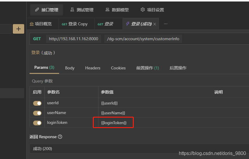 然后下个接口直接用{{loginToken}}引用。不需要配置全局了。看来方便一些。