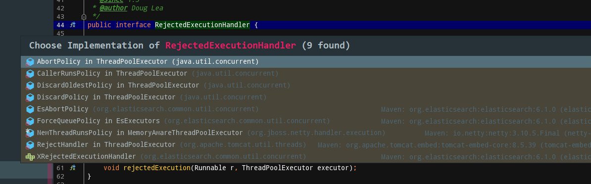 通过观察源码可知:所有的拒绝策略他们都实现了RejectedExecutionHandler