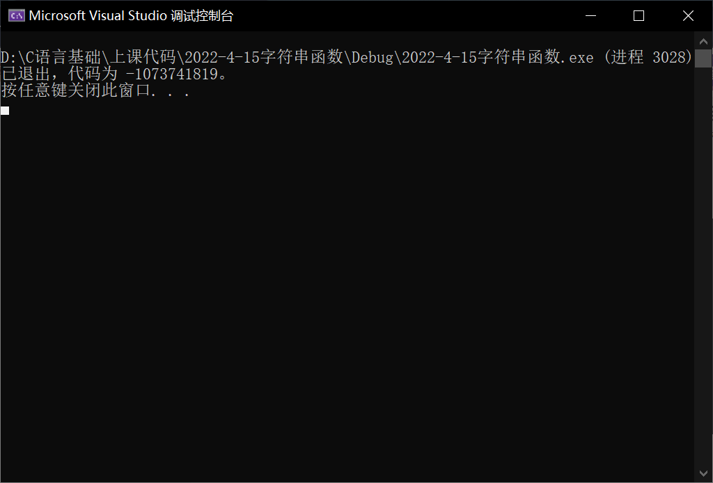 由上可见,程序崩溃。是因为arr2没有定义大小,strcpy在拷贝时,将内容拷贝完成后没有找到‘\0’,导致程序崩溃 。