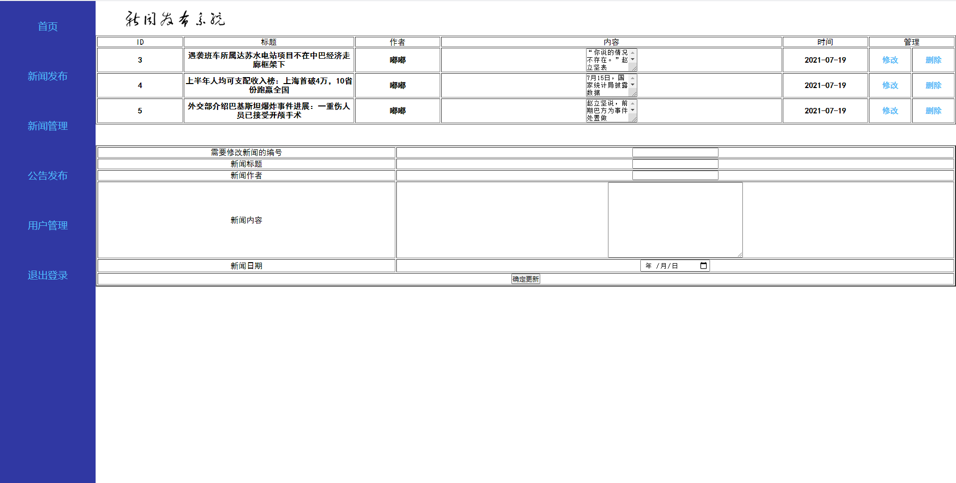 登录、注册、新闻发布、新闻管理、公告发布、用户管理、退出登录