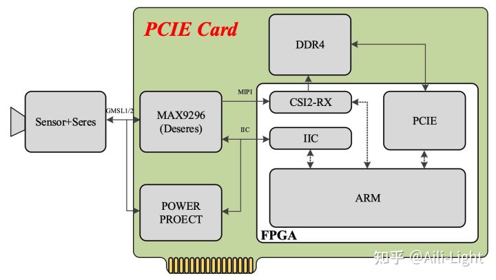 1) 摄像头(Sensor+Serdes)的图像数据通过GMSL同轴连接线传输到采集卡的解串芯片(DeSerdes, MAX9296)上