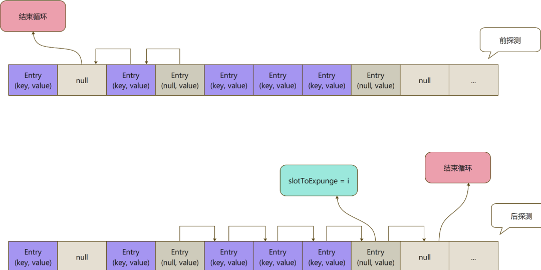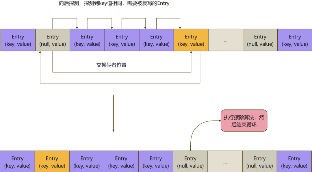 在上面的cleanSomeSlots方法中,只要在探测节点的时候,没有遇到Entry的key为null的节点,该方法就会返回false
