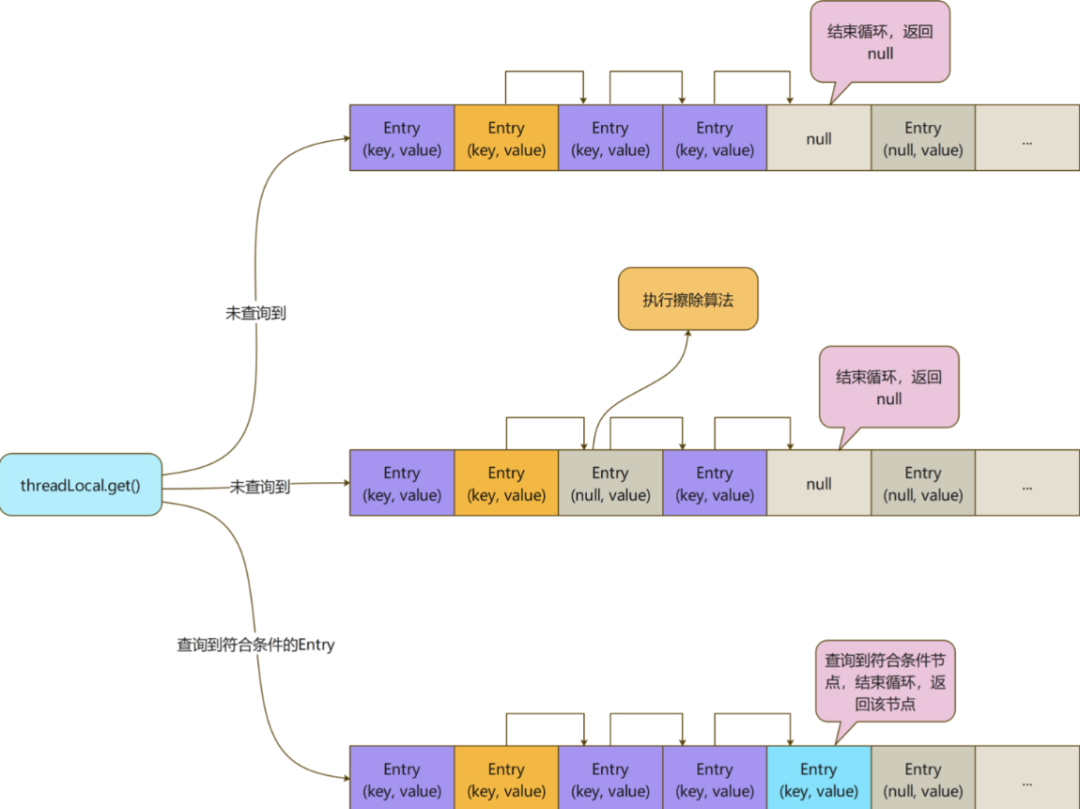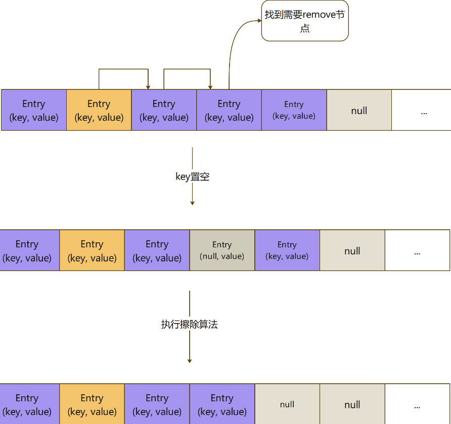 逻辑非常的清晰,通过ThreadLocal实例,获取当前的index,然后从此开始查找符合条件Entry,找到后,会将其key值清掉,然后执行擦除算法