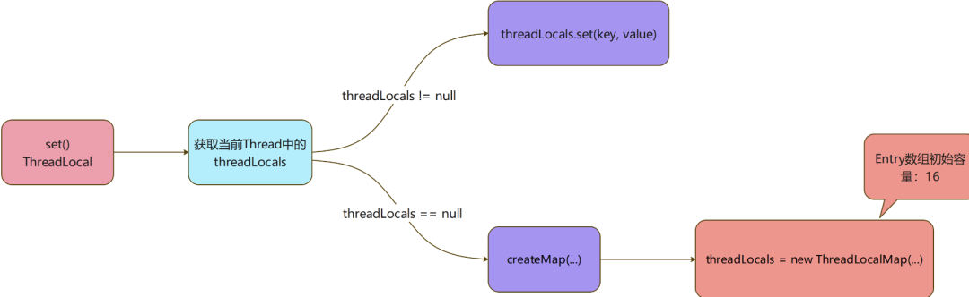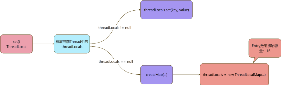 当我们执行ThreadLocal的set操作,第一次则新建一个Entry或后续set则覆盖改Entry的value,塞到当前Thread的ThreadLocals变量中