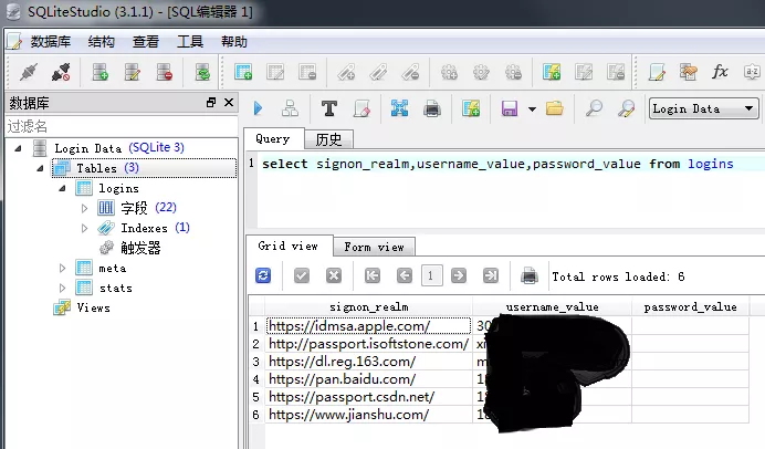 打开数据库,我们看到有三张表:logins 、meta、 stats其中logins中就存储这你保存的网址、用户名、密码数据,分别是:signon_realm,username_value,password_value但问题来了,password_value的字段看着是空的啊?因为加密了!如何解密?网上查了下: