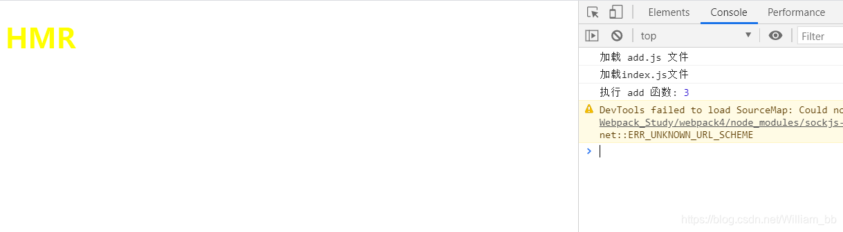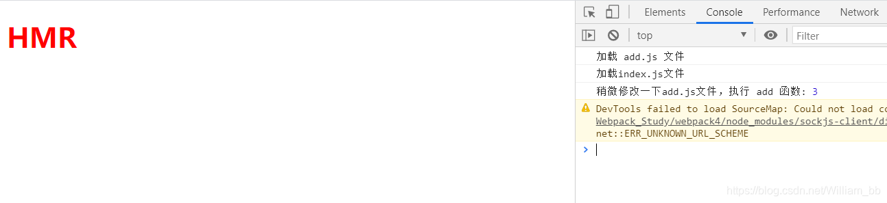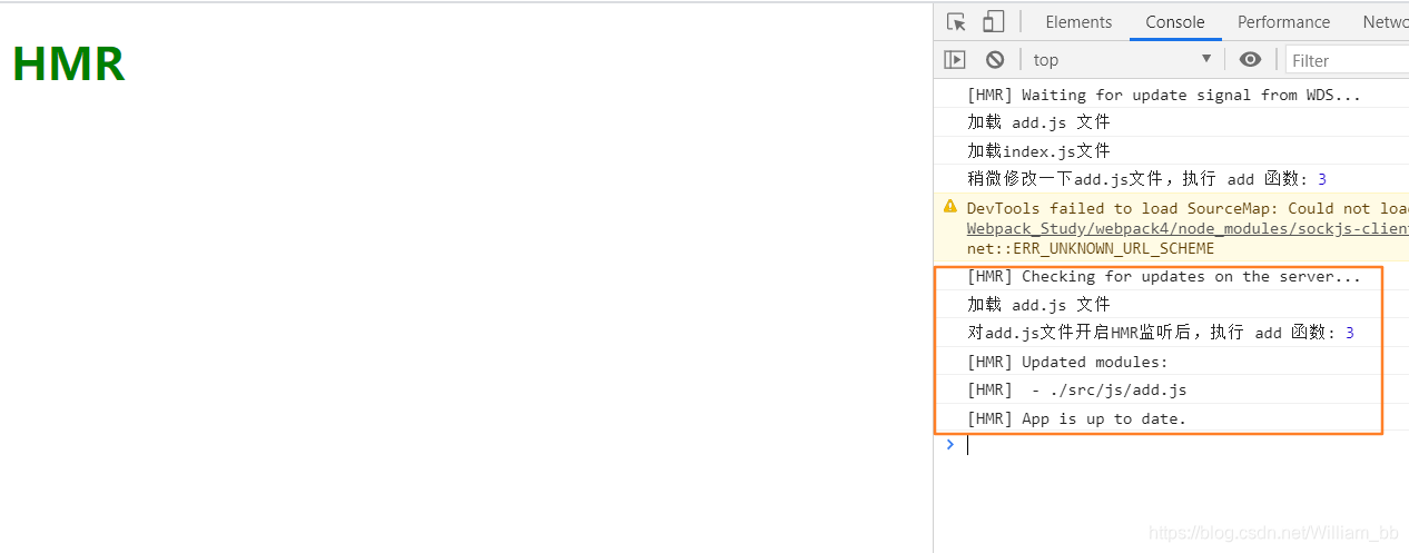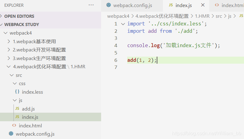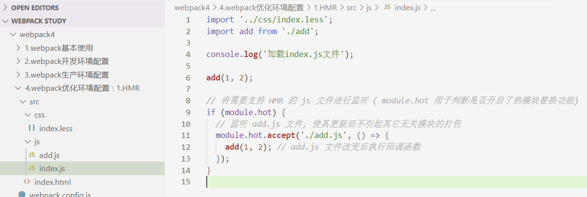 HMR 功能生效了。但是,假如你修改的是 add.js 文件,你会发现页面还是重新刷新了。这是因为样式文件默认可以使用 HMR 功能,这个功能在 style-loader 内部实现了。而 js 文件默认不能实现这个功能,要实现对 js 文件的热模块替换,我们需要在入口文件 index.js 中添加支持 HMR 的代码: