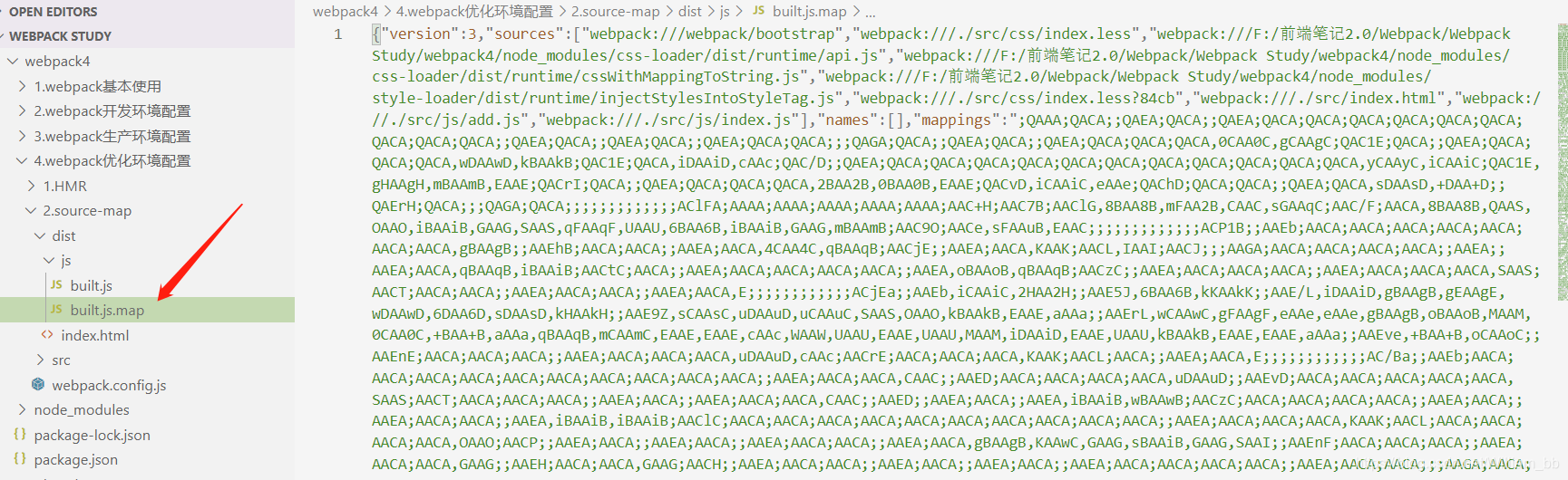 我们直接运行 webpack,然后查看打包后的 js 文件,你会发现多了一个 .map 文件。这个文件保存的就是打包后的 built.js 与打包前的代码之间的映射关系。