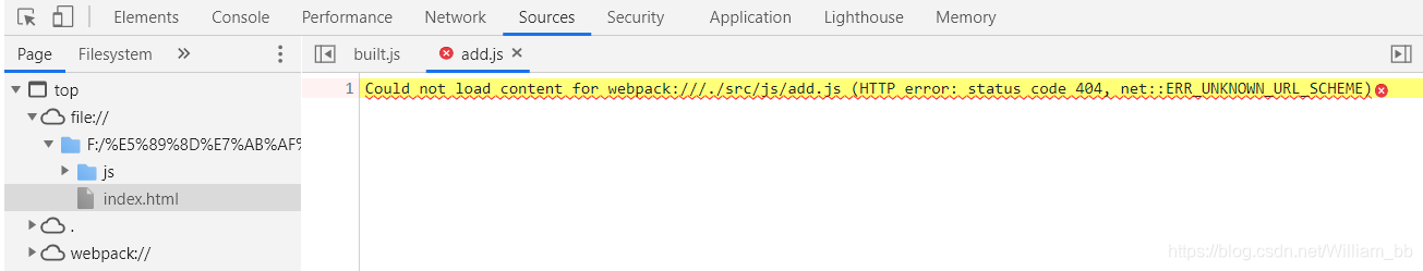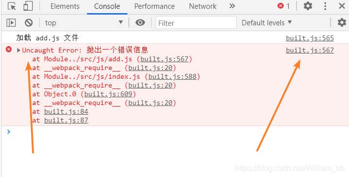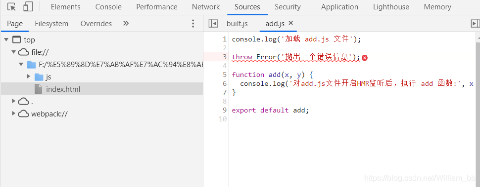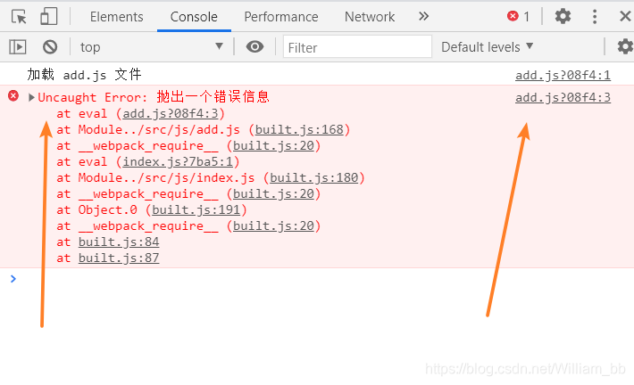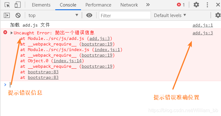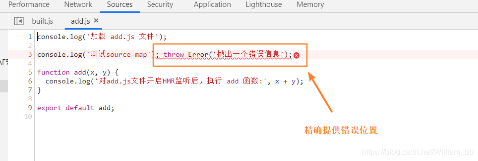 此时打开浏览器控制台,你会发现它会精准提供错误代码的错误原因以及源文件代码(add.js)的错误位置: