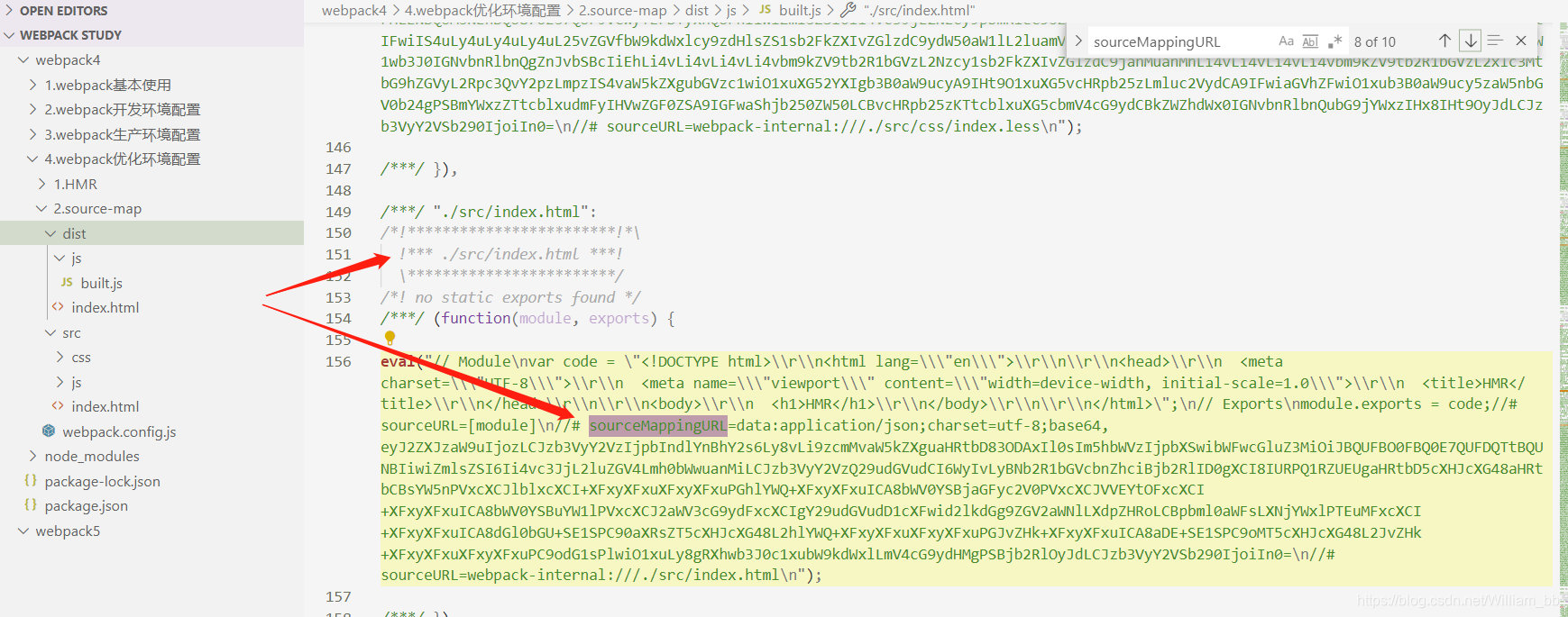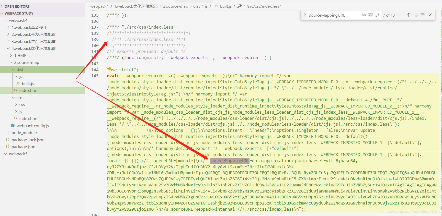 例如,当你将 devtool 设置为 inline-source-map,然后运行 webpack,你会看到打包后的代码在 built.js 文件底部直接生成整体的 source-map 信息: