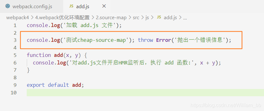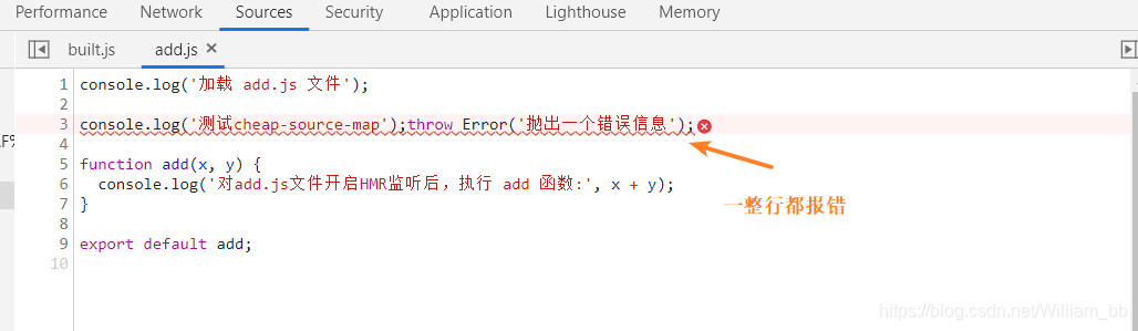 cheap-source-map 要和我们一开始的 source-map 配置项来进行对比,我们先在 add.js 文件的错误代码同一行添加其它代码测试一下: